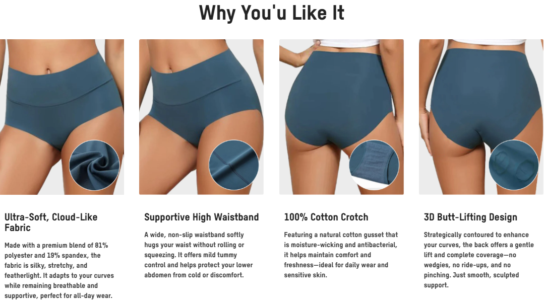 Crafted from a premium polyester-spandex blend, the fabric feels silky-smooth, lightweight, and breathable—adapting perfectly to your body’s shape. A 100% cotton gusset adds freshness, moisture control, and antibacterial protection, making it gentle and safe for daily wear.
